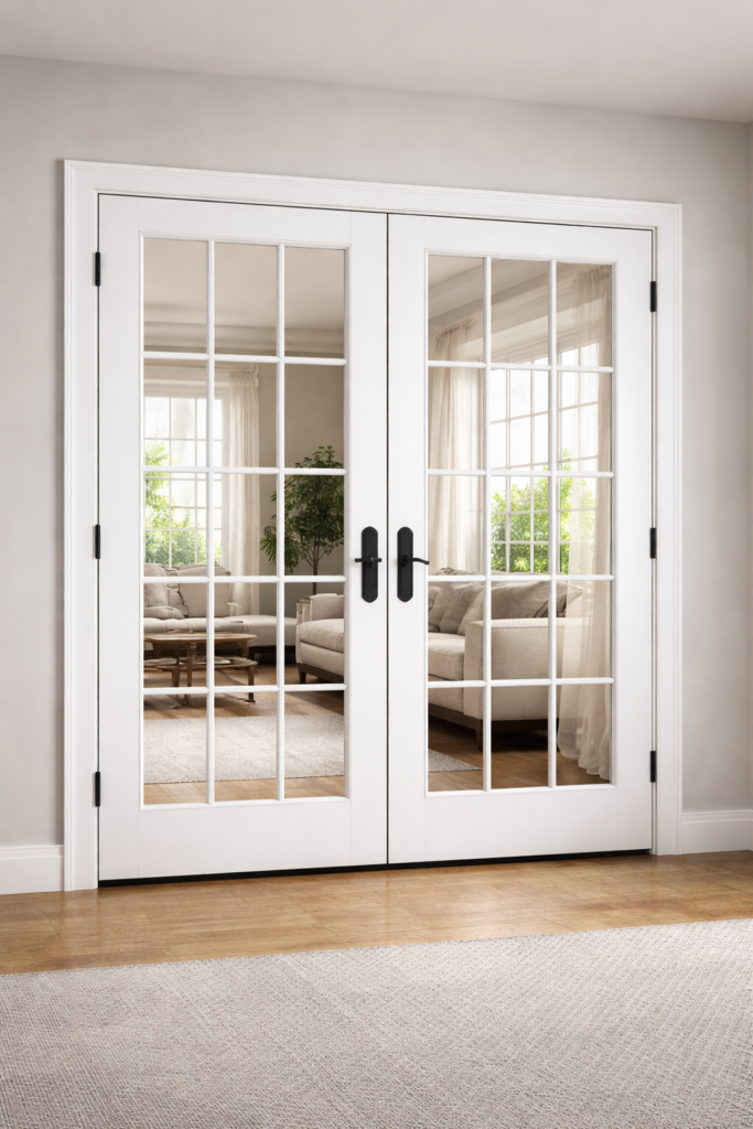 A set of two adjacent doors, primarily featuring extensive glass paneling, that add architectural charm and natural light to a space
