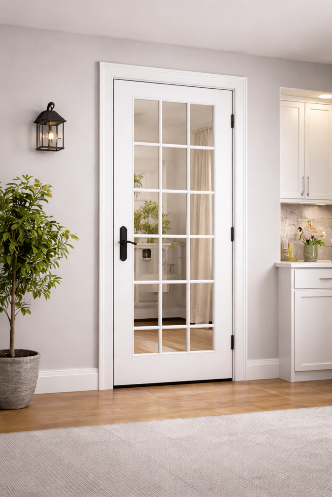 A single-hinged door that features multiple glass panels (lites) running most of its length within an elegant frame